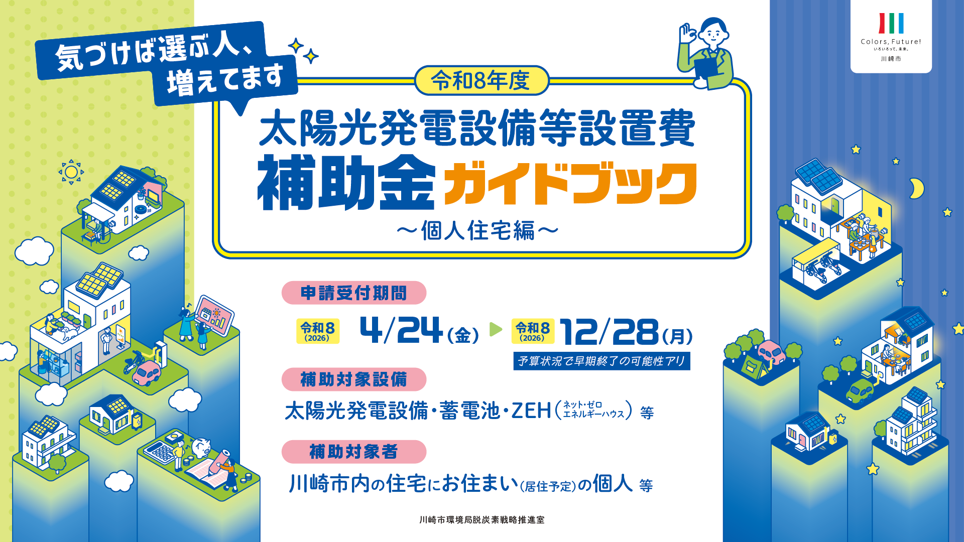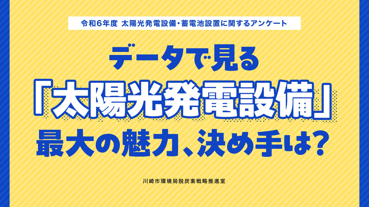 川崎市では、2050年の脱炭素社会の実現と2030年度の市域の温室効果ガス50%削減(2013年度比)を目標に掲げ、様々な取組を進めています。この取組の1つとして、「再生可能エネルギーの普及」があります。本市は市域のほとんどが市街化されているという地域特性から、再生可能エネルギーの導入量を多く増やすためには、最も導入ポテンシャルがある「建築物への太陽光発電設備設置」を進めていく必要があります。