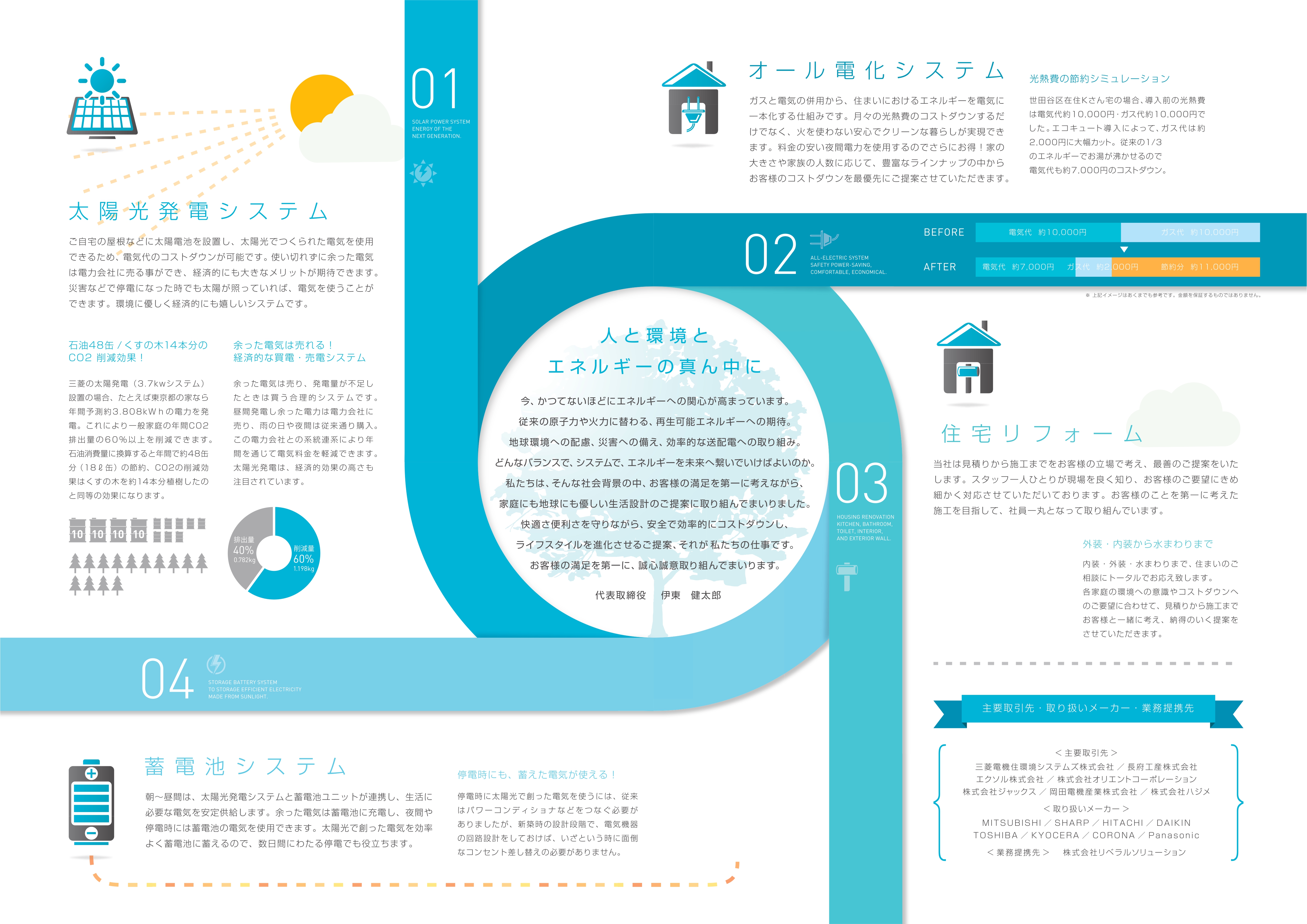 ・グローバルライフでは、再生可能エネルギーを利用した発電や、オール電化によるCO2の削減など地球環境に配慮した商品でお客様のくらしを安心・安全・快適にするご提案をしております。