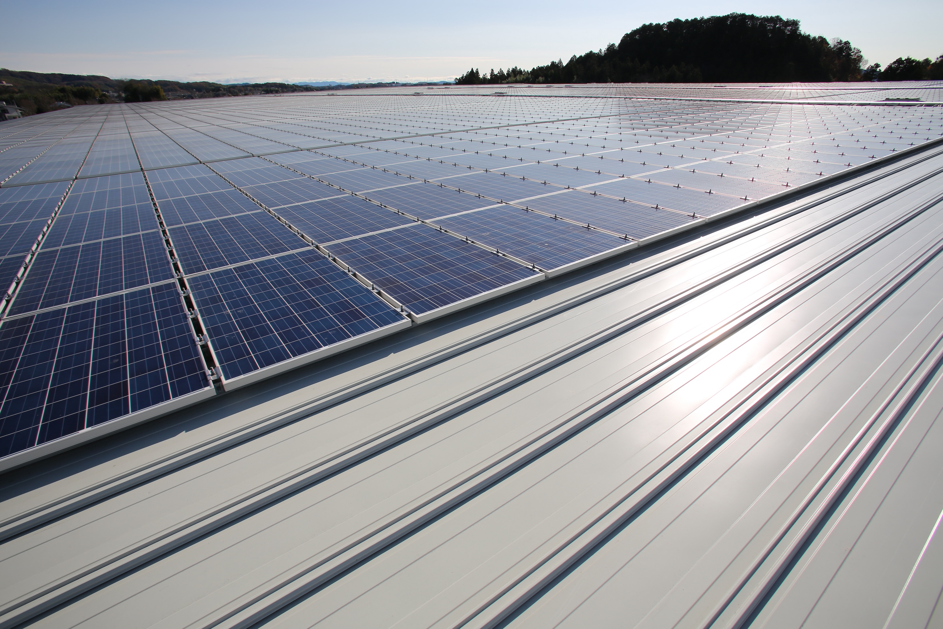金属瓦棒屋根上に専用金具を取付け、屋根に穴を明けずに太陽光パネルを敷設致します