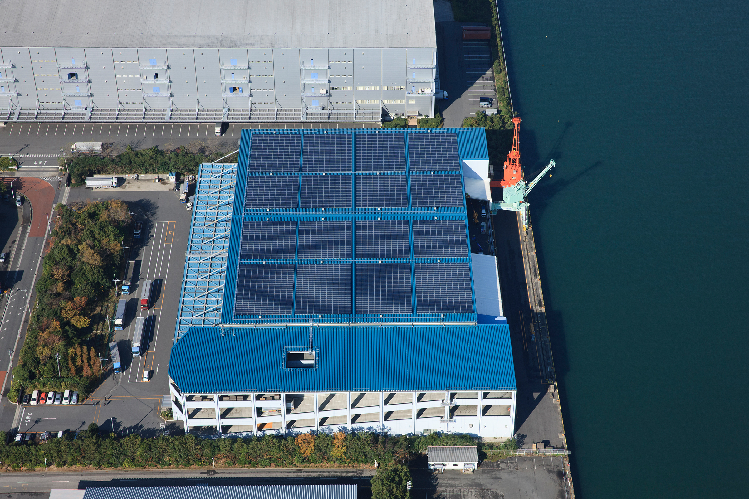 海に面した大型倉庫の金属屋根改修(既存屋根上に全面新設屋根)工事に合わせ太陽光パネルの他、蓄電池などシステムとして施工致しました