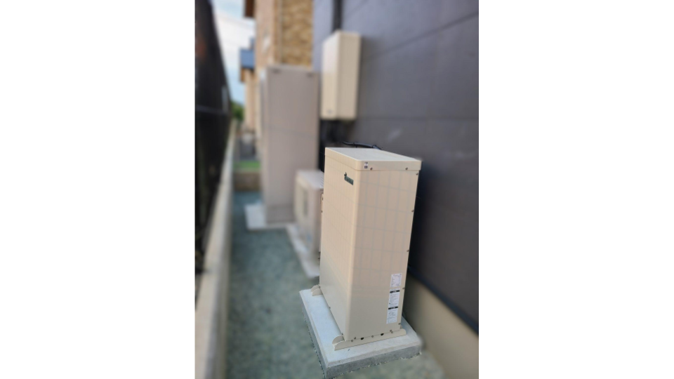 極力機器をまとめたいとの事でしたので、エコキュートやヒートポンプの近くに設置し、外観の色合いが不自然にならないように設置いたしました。外観が綺麗なまま太陽光発電を設置したい、配線を極力露出したくない、外から見えない場所に蓄電池を設置したい等多くのご要望にお応えをしております。