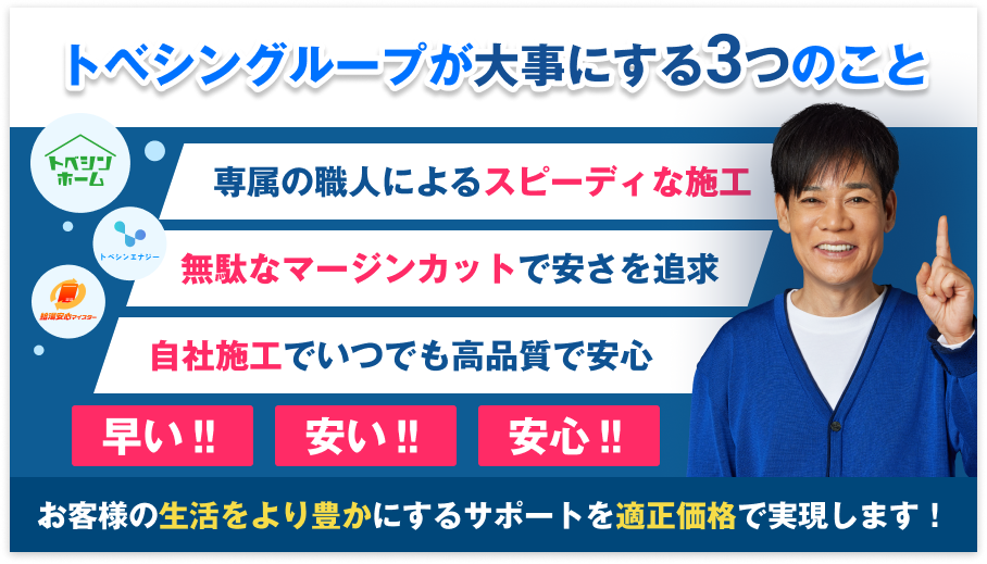 トベシングループが大切にしていることは、早く、安く、安心のサービスを提供することです。