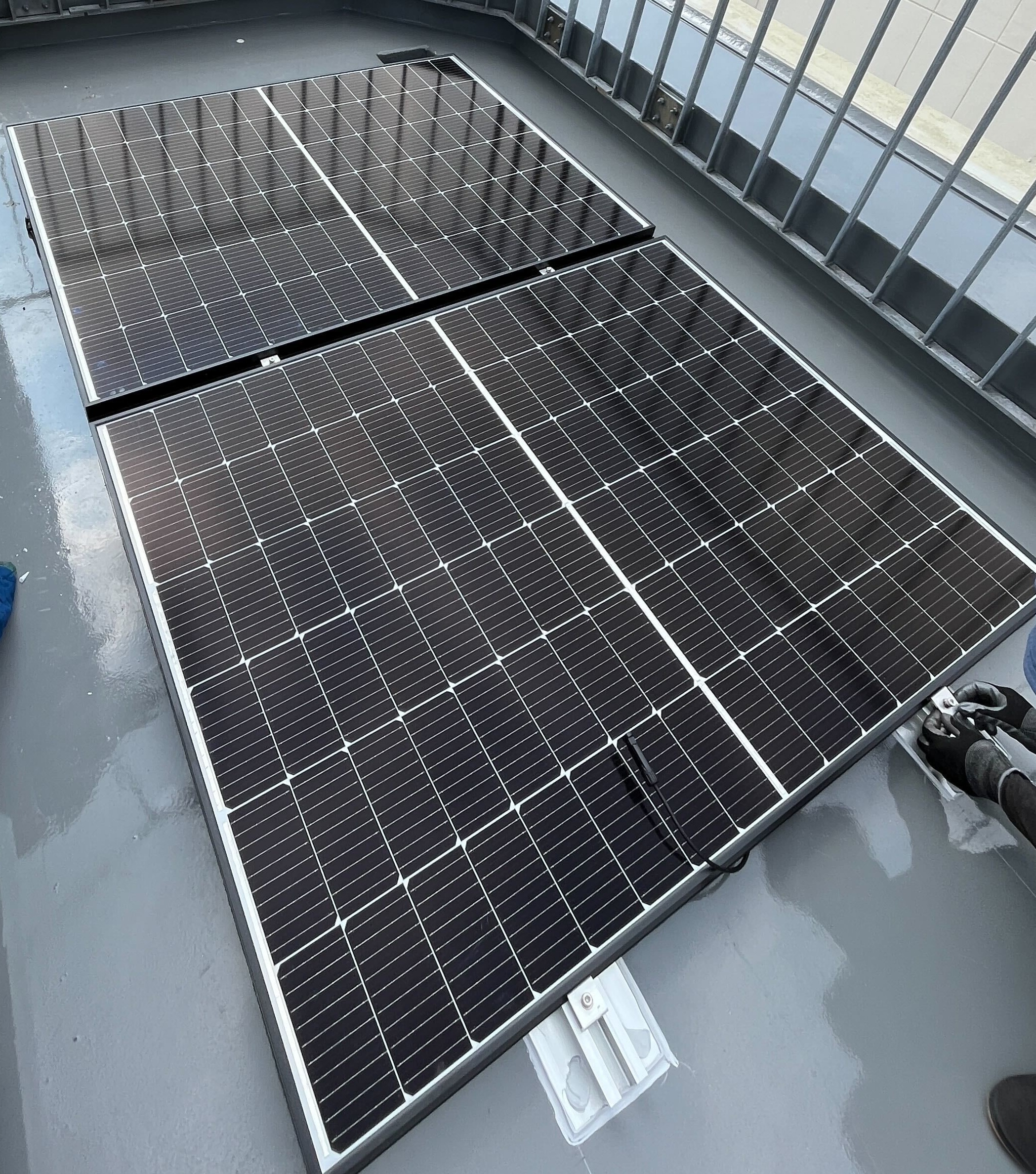 本施工では数ある陸屋根用架台の中から、ボンド架台施工を採用し、防水層への負担を抑えつつ安定した固定を実現。置き架台に比べてパネル間隔を最小限にできるため、限られた屋根スペースでも多くのパネルを設置し、発電量の最大化につなげています。