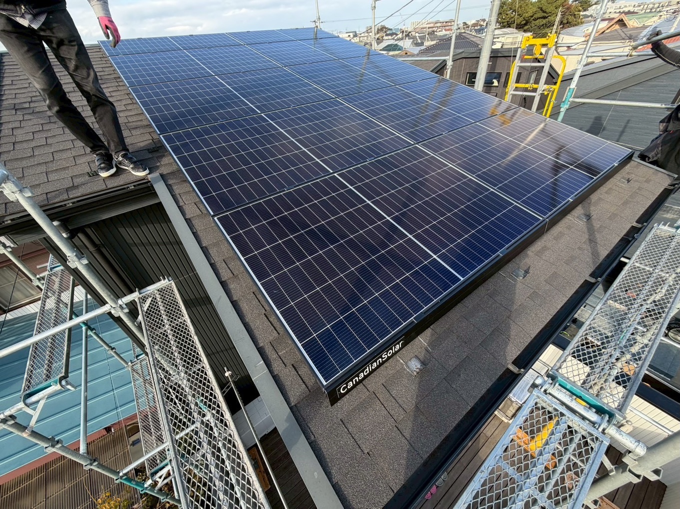 北面の屋根スペースも有効に使いたいとのご要望でしたのでご近隣の方への配慮を考慮し、”防眩パネル”を使用し工事を施工。発電量の確保と近隣の方へのご配慮に大変ご満足いただきました。