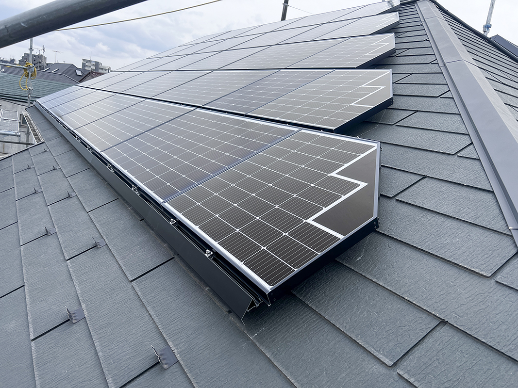 長州産業の台形モジュール(パネル)を活用しながら屋根の有効面積を最大化。屋根にフィットするパネルレイアウトプランで、太陽光発電容量6kW超を実現できました。