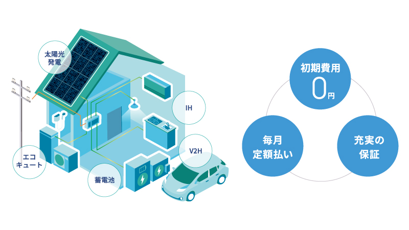 弊社は東京電力グループの住宅省エネ設備の設置工事会社です。初期費用0円、月々定額で省エネ設備がご利用いただけるサービス「エネカリ」で、太陽光発電システム、蓄電池、V2H等を導入いただけます。エコキュートやIHなどオール電化設備の設置・交換も可能です。ご相談やお見積もりなど、お気軽にお問合せください。