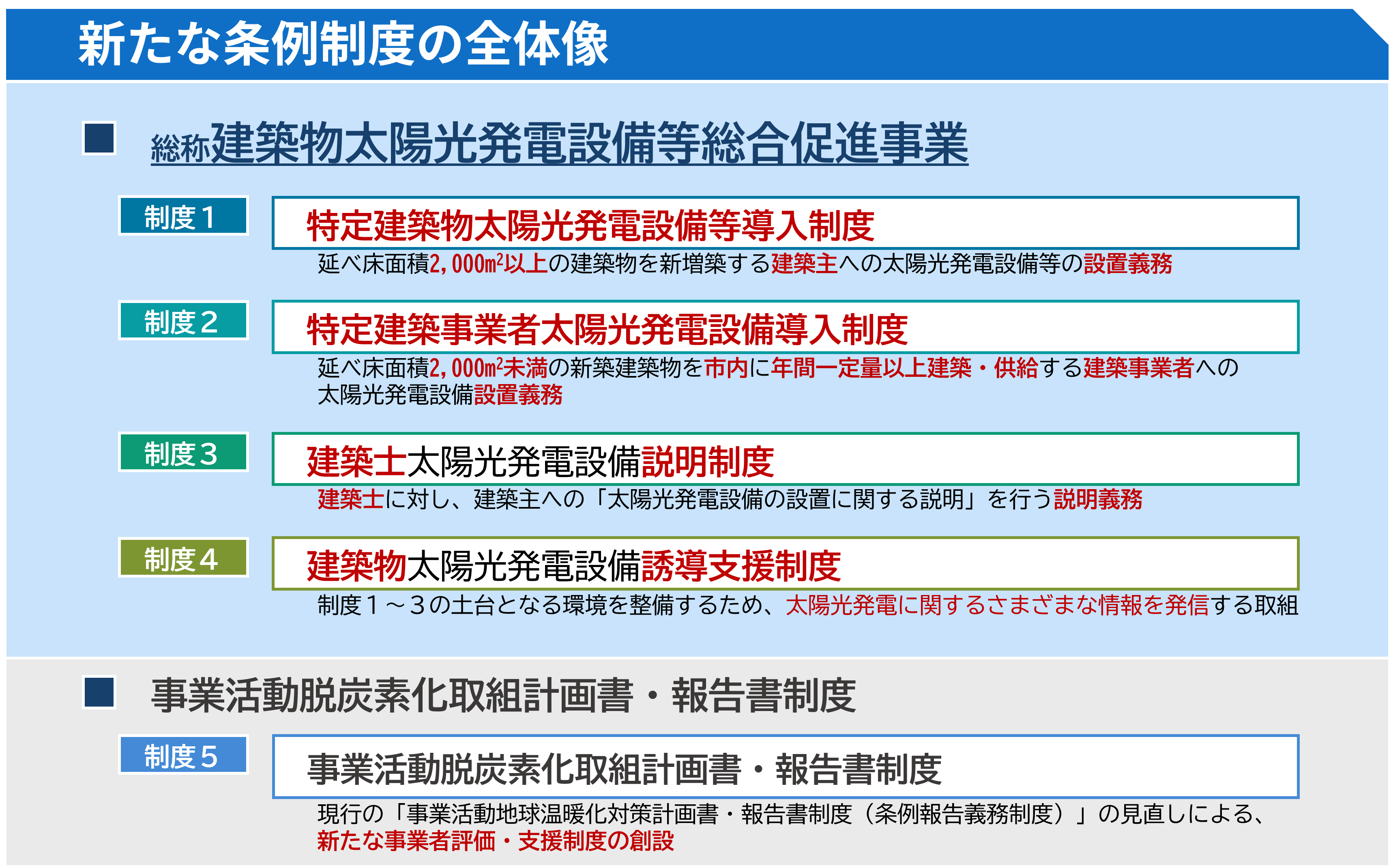 さらに、川崎市地球温暖化対策推進基本計画の改定を踏まえ、2050年までの脱炭素社会の実現を目指すことを条例に位置付けるとともに、産業部門、民生部門の先進的な取組として、次の5つの新制度を位置付けました。